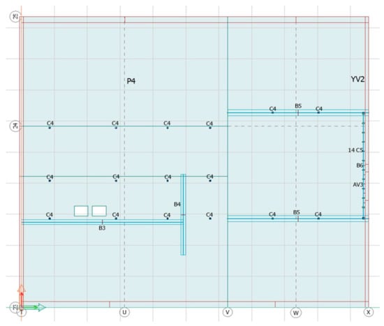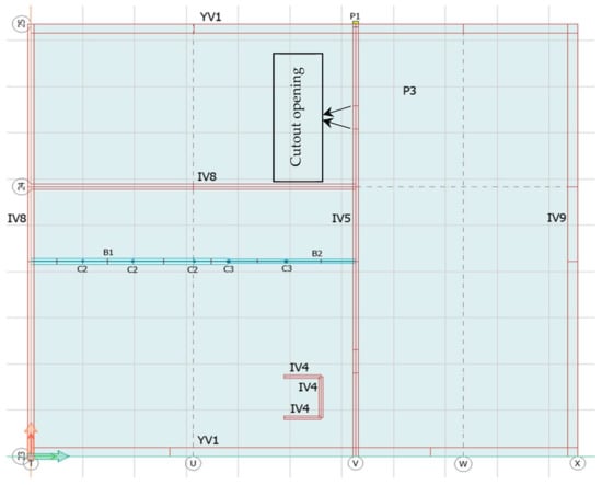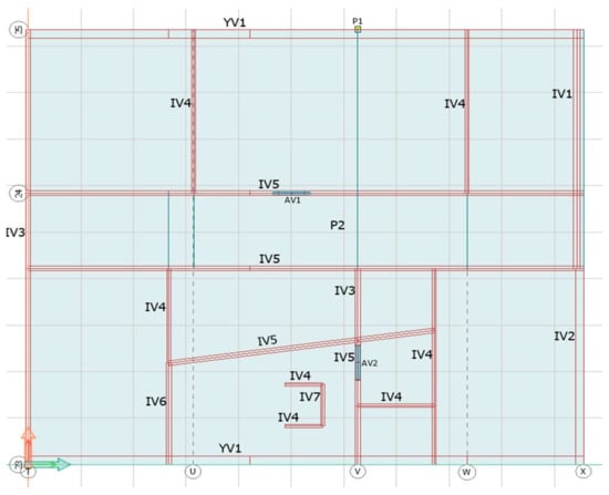 Table 1 lists specifications of the building’s stories, which have been considered in the modeling. The properties of the load-bearing elements of the building are summarized in Table 2. The location of each load-bearing element of the modeled building is demonstrated in Figure 6, Figure 7, Figure 8, Figure 9 and Figure 10. Plan of the basement floor and walls is illustrated in Figure 6, in which P1 is the RC slab and W1 & W2 are load-bearing RC walls. Figure 7 depicts the floor, which is located under the EW. P2, IV1–IV7, YV1, and AV1 & AV2 are the RC slab, load-bearing RC walls, brick wall, and steel headers and studs, respectively. Figure 8 clarifies the floor, where the EW is located on axis V between axes 24 and 25 with the indicated cutout opening. In this figure, P3, IV4 & IV5, IV8 & IV9 & YV1, B1, B2, and C2 & C3 are the RC slab, load-bearing RC walls, brick walls, RC beam, steel beam, and steel columns, respectively. The attic is the story above the EW, as displayed in Figure 9. P4, YV2, B3, B4 & B5, B6, C4, C5, and AV3 are the RC slab, brick wall, steel beam, RC beams, timber beam, steel column, timber column, and steel header, respectively. In Figure 10, all timber beams along Y and X directions are B7 and B8, respectively, while all the timber boards between the rafters are P5.
