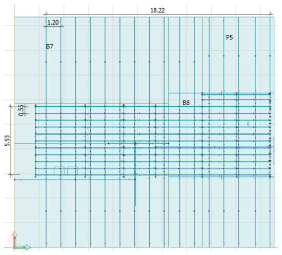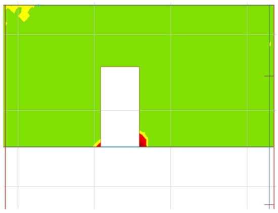 An opening with the dimensions of 1.01 × 2.11 m was then created in the wall in the second story (under attic) between axes 24 and 25 (Figure 17). The utilization ratio of the wall was increased to 223% due to the cutout opening, which was larger than 100% uncovering the incapability of the wall in withstanding the loads; therefore, the wall needed to be strengthened. The increase of the utilization ratio was because of the fact that reinforcements in the place of the opening were cut and discontinued from other parts of the wall, also, the concrete was cut out and reduced in the wall where the opening was made. These discontinuations of the reinforcements and concrete in the wall affected the integrity of the wall in the opening. As a consequence, the remaining reinforcements and concrete of the wall had to compensate for the tensile and compressive forces that the removed part of the wall previously withstood. Figure 18 elaborates the utilization ratio of the wall in contour after the cutout opening. The presence of the cutout opening in the wall led to the disturbance in the uniform pattern of stresses. The discontinuities in the stresses caused high stresses in the small region of the wall as stress concentration. The deflections of the wall before and after creating the cutout opening were acceptable and had a little difference.
