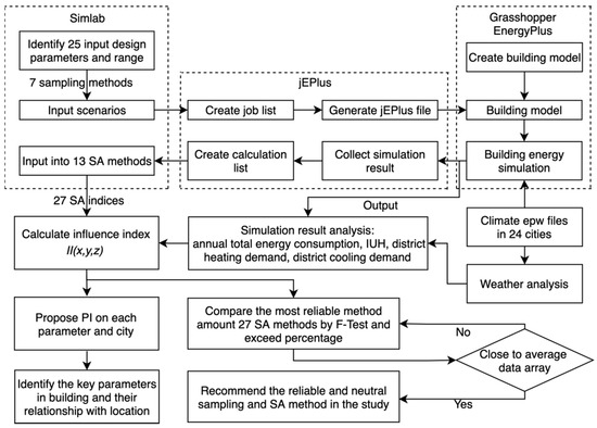 Figure 1 shows the framework for this study. At the beginning of the research, the case building model was built by Grasshopper. Then we used seven different Monte-Carlo sampling methods in SimLab to establish input scenarios for EnergyPlus and jEPlus to simulate the annual total energy consumption, IUH, district heating demand, and district cooling demand of a building in 24 climate locations. Then, the simulation results were input back into SimLab for SA with 27 different indices, and all SA results were input into the influence index formula from Equations (1)–(3) to calculate the comprehensive value of PI, which could evaluate the influence of parameters more accurately compared with other studies. The following research was divided into two parts. In the first part, we evaluated the PI of each parameter on energy demands and IUH and determined their relationship with geographical locations. In the second part, we explored the reliable and neutral SA method by F-test and exceed percentage among 27 SA indices.