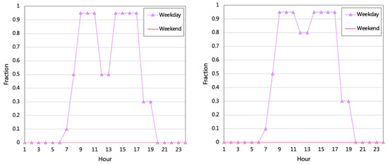 Table 3 presents the list of input parameters and their variation range on the input space of the building model. Twenty-five parameters in the building envelope, internal gain, and system operation were researched in this building. The selection of input parameters was based on factors that have commonly been researched for the energy demand and comfort of buildings in the relevant literature [58,59,60]. We applied the ideal load air system to the model, and the people, lighting, and equipment schedules were set based on the statistic of the working schedule in the field, as shown in Figure 3. The lighting and equipment in the building gradually worked from 6 a.m. and closed at 8 p.m., with a lunch break between 12 a.m. and 1 p.m.