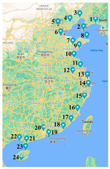 Afterward, the building model was simulated with the climate data of different locations to compare the changes of sensitivity in parameters. We selected these places from 24 cities along the eastern coastline of China, as shown in Figure 4, which are arranged from north to south with a change of serial number. According to the climatological zoning for buildings in the relevant standard [61], these cities belong to three climatic zones: Cold area (II), Hot summer and cold winter area (III), and Hot summer and warm winter area (IV). All information about these locations is shown in Table 4.