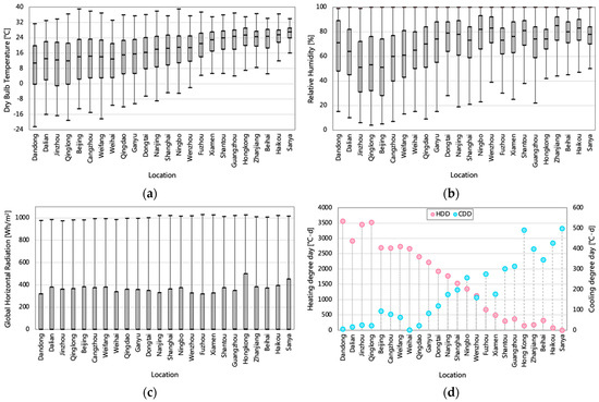 Analysis of EPW weather data in 24 coastal cities: (a) DBT; (b) RH; (c) GHR; (d) HDD and CDD.