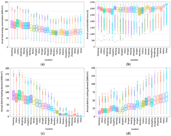 Then, we analyzed the annual total district heating and cooling demand. The annual total energy consumption of the building can be divided into three parts: district heating demand, district cooling demand, and interior equipment energy demand. As shown in Figure 6c, the upper and lower quartile range and average value in the annual district heating demand change significantly with latitude. The average value of Dandong in the northernmost area is the largest, reaching 89.9 kWh/m2, and then decreases from north to south with latitude, dropping to almost 0 kWh/m2 in Sanya. Therefore, the district heating demand is greatly affected by climate conditions. At the same time, starting from Xiamen, the average values of the later cities tend to be close to 0, and the upper and lower quartile range become almost the same, thus indicating that the change of annual district heating demands of buildings after the climate of Xiamen is very small. The southern cities are warm enough in winter and do not have too much district heating demands, while the cities in the north are colder in winter and consume considerable heating energy.
