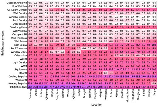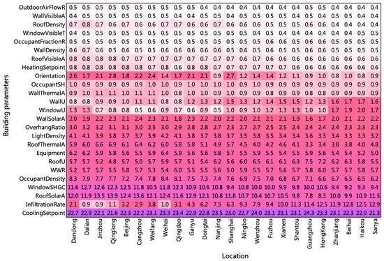 The fourth analysis chart is the PI of each input parameter with regard to district cooling demand. It should be noted that the energy consumption of district cooling demand in northern cities is small but increases as the location changes from north to south. The district cooling demand in Sanya is about four times that of Dandong, so the important parameters should be ranked in order starting with southernmost Sanya. In Figure 10, the largest influence factor of district cooling demand is the cooling setpoint in Sanya, with an PI of 21.3%. However, the influence of the cooling setpoint does not change with geographical location and was maintained at the PI of 21–24% in these 24 coastal cities. The second parameter was infiltration rate, which had an impact of 12.9% on Sanya. The infiltration rate maintained a 10% PI between Sanya and Xiamen but gradually declined as the location moved north, dropping to 0.9% in Jinzhou and Dalian.
