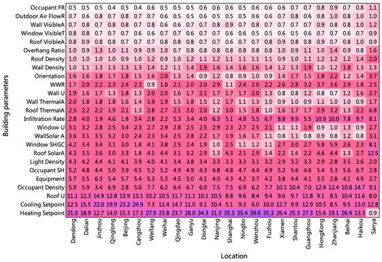 Figure 7 shows the analysis results of the influence index in 25 input parameters on annual total building energy consumption. The ranking of input parameters in the chart is determined by the PI of the first city. The parameters with the highest PI are ranked below, and the one with the lowest percentage is ranked above. The sum of influence values of all parameters in each city is 100%. The detailed relationship of each parameter will be discussed in the next section.