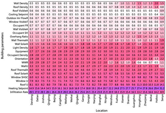 The infiltration rate was the biggest factor affecting the total energy consumption in the northern cities. In Dandong, the impact of infiltration rate on total energy consumption was 28.4%, which gradually decreased with the change of location from north to south and reached only 11.2% in Sanya. It is also worth noting that the PI of infiltration rate from Xiamen was maintained at about 12%, indicating that the climate change with location is not obvious. The second influencing factor was the heating setpoint of the building. The influence index in Dandong was 15.6%, which was significantly lower than the infiltration rate. With the change of location from north to south, it reached a maximum value of 17.3% in Weihai and then decreased to 0.9% in Sanya, which only ranked 16th among the 25 influencing parameters in Sanya.
