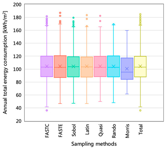 The first step was to explore the impact of different sampling methods on building energy consumption because the logic of each sampling method is different. By comparing the simulation results of seven different sampling methods on an EnergyPlus model in a statistical box chart, the accuracy of the influence assessment of various SA methods on input parameters could be further realized. As shown in Figure 11, we analyzed the simulated values of annual total energy consumption of seven sampling methods and their comprehensive values in Qingdao, which is the real building location and the example used in this section. The average and median values of various sampling methods were similar, but we observed slight differences in the upper and lower quartiles and significant differences in the maximum and minimum values. FASTC and FASTE have a wider range of data because they periodically sample input data with sinusoidal function. Sobol’s upper and lower quartiles and the gap between maximum and minimum were smaller than the FASTC and FASTE values. In the comparison of simulation results of LHS, QRS, and RS, the quartile value of LHS was the smallest, while the QRS had the smallest maximum and minimum values, and the change range of RS was the largest. On the other hand, the Morris sampling method differed from other numerical methods because it is a one-step-at-a-time method. Each parameter was sampled once, and only 260 samplings were performed in the simulation.