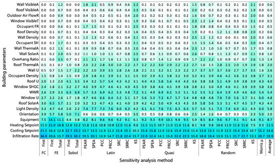 To choose the most neutral and extensive influence assessment method, each sampling and sensitivity evaluation method had to be compared. We used the PI of annual building energy consumption to make comparisons in this section. In Figure 12, we found that the percentages of PEAR, SPEA, PCC, PRCC, SRC, and SRRC differed significantly from other evaluation methods in terms of the orientation on total building energy consumption. At the same time, the values of KS in three different sampling methods differed from other methods, which had relative mean values on various influencing factors, such as infiltration rate, heating, and cooling setpoint. On the one hand, it had a low evaluation value on the influential factors. On the other hand, the unimportant parameters obtained a high evaluation value in KS, such as the visibility absorptance of the wall and roof. In the comparison, FASTC and Sobol could distinguish the PI of each factor. The influential factor had a greater value, while the unimportant factor tended to be 0. For example, they evaluated more than 30% influence of the infiltration rate, while the least influential factors, such as window visible transmittance, were close to 0.0%. Therefore, the average PI of the 27 sensitivity evaluation methods used in this study can greatly reduce the impact of various extreme values from different sampling and SA methods and thus obtain a more accurate PI.