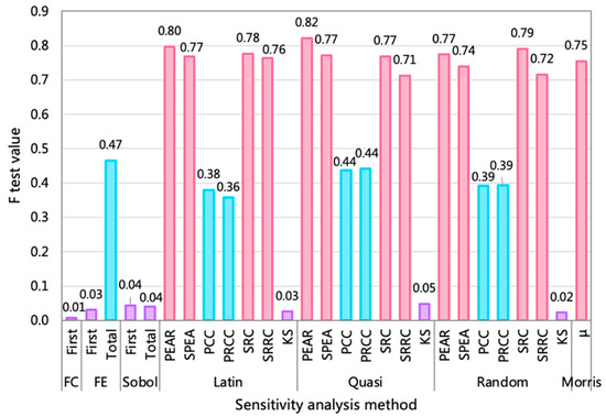 In the evaluation of the F-test, the data set evaluated by each method was compared with the data set of the average value. Although the mean data set does not necessarily represent the most accurate sensitivity value, it can represent the most neutral, extensive, and reliable value. As shown in Figure 13, FASTC has the smallest value, followed by FASTE-first order, Sobol, and KS in each sampling method. Therefore, they are the most different evaluation methods from the average data set. Then, we observed FASTE-total order and the PCC and PRCC in three sampling methods, and their F-test values were in the middle of the chart, which were still close to the average data set. The rest of the PEAR, SPEA, SRC, SRRC, and Morris methods had an F-test value above 0.7, among which SRC, SRRC, and Morris have been widely used SA methods in many studies. Among them, the two largest values of the F-test were PEAR in the QRS and LHS methods, which reached 0.82 and 0.8, which were the closest to the average data set. Meanwhile, the SRC of the RS and LHS methods were 0.79 and 0.78, respectively. Therefore, the recommended SA indices in the F-test part were Quasi-PEAR, Random-SRC, and Latin-PEAR.