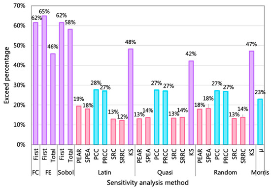 We then added up the difference between the influence value and the average value of the factors in each method to obtain the cumulative percentage difference between each method and the average data set. The values in Figure 14 consider the mean percentage value of four outputs in this paper, so the smaller the difference between the data set and the average set, the more accurate the data is to the average. The results in Figure 14 are similar to those in the F-test. The exceed percentages of FASTC, FASTE, Sobol, and KS are all over 40%, the largest cumulative difference from the average data set. The second level includes PCC, PRCC, and Morris, which all had a cumulative average gap between 20% and 30%. Finally, the PEAR, SPEA, SRC, and SRRC were all less than 20%. The smallest of them were SRRC and SRC in the LHS method, with values of 12.2% and 12.9%, respectively. PEAR in the QRS method was 13.0%, while the SRC in the RS method was 13.1%.