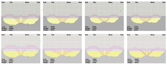A more advanced version of the program similar to eQUILIBRIUM is the StructureFIT developed by Caitlin Mueller, which allows not only optimization within the assumed topology of bars, but also the selection of the most appropriate one due to architectural conditions, which is often omitted when looking for an optimal solution due to e.g., the criterion of minimum stresses. Thanks to the use of an evolutionary algorithm, it is possible to explore various groups of designs, choose the most favorable ones and then generate next generations using mutation rate, the degree of randomness introduced when a new population of designs is generated [15]. The operation of searching successive design spaces can be carried out until the most favorable version is selected for any quantitative or qualitative criterion (Figure 1c).