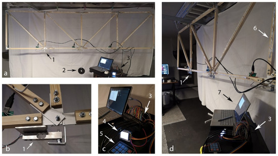 Elements of a truss (1—tensometric beams, gyroscopes, 2—loads, 3—microcontroller, 4—mini display, 5—membrane keyboard, 6—LED strips, 7—PC); (a) general view of the truss with a load; (b) view of the node with a tensometric beam; (c) view of the microcontroller, minidisplay and membrane keyboard; (d) view of the truss without a load.
