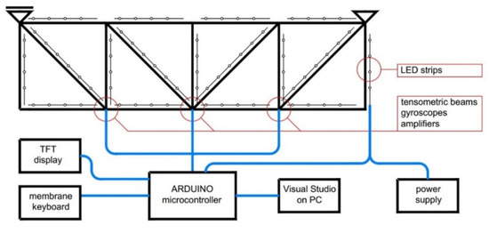 Tensometric beams, deforming under loads, are located under the nodes in a way that simulates the load on the truss at the nodes (Figure 4b). The devices check the voltage of the current flowing through the electrical system inside. This voltage changes with the help of the Wheatstone bridge along with the microscopic deformation (which depends on the elastic parameters of material) of the beam geometry caused by external loads, and thus compression or stretching of the internal current-conducting paths, which in turn affects their own resistance and, further, the current intensity [19]. Voltage changes are measured and then sent from the tensometric beam to the amplifier. The adopted model of a tensometric beam allows it to be loaded with a maximum force of 20 N, but it is possible to use other models of any strength (e.g., 50, 100, or 150 N). Ultimately, the only limitation is the strength of the truss itself. Tensometric beams are attached to gyroscopes, which together with the beams and amplifiers are responsible for reading the angle of inclination, and thus allow reading the direction of the forces applied to the truss. The amplified signal reaches the Arduino Mega2560 microcontroller and is recognized as the corresponding value of the force applied to the beam and further processed. Amplifiers, tensometric beams, and gyroscopes, due to the low power consumption, are powered directly from the Arduino microcontroller (Figure 4).