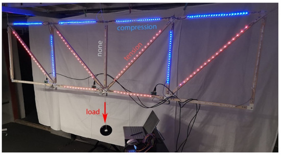 The data processed by the microcontroller is transmitted to LED strips attached to the truss. LED strips are divided into sections corresponding to the bars. The microcontroller sends them information about the intensity and color (blue for compression, red for tension, off for 0), which changes the light emitted by the LEDs (values from −256 to +256 are processed by Arduino into values from 0 to 256 with two different colors depending on the nature of the force). The loop of data collection, processing, and sending to the LED strip is performed with a frequency of 2 Hz to avoid overloading the microcontroller (Figure 5).