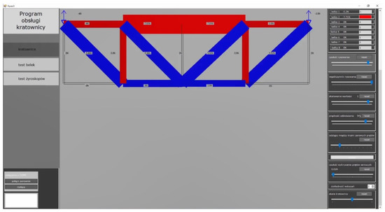 To present the results on the screen of any computer, a program was made in Visual Studio to receive data from the microcontroller and present it in real-time. After its launch, a window is displayed, where the truss is presented with the use of colors together with the collected values of forces in the bars. Each bar has an individual thickness and a suitable color (blue for compression, red for tension, off for 0). Both parameters depend on the force calculated on the bar. Additionally, it is possible to assign a cross-section to each bar and calculate the stress value in a given bar. The program also displays graphs from the tensometric beams test and the gyro test (Figure 7).