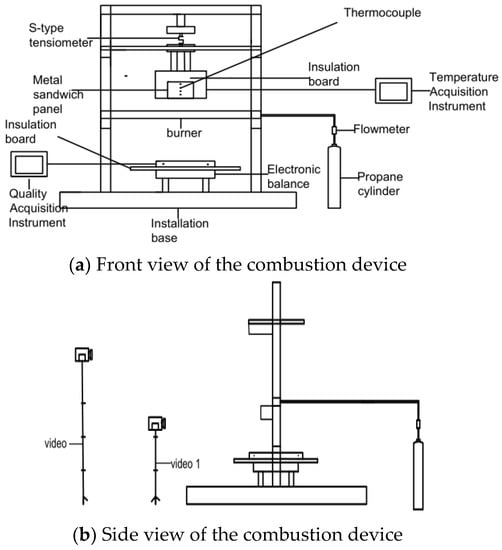 This experimental device was a self-designed combustion device for the metal sandwich panel, as shown in Figure 1. The test device consisted of four parts: the weighing system, the video image acquisition system, the temperature acquisition system, and the ignition source.