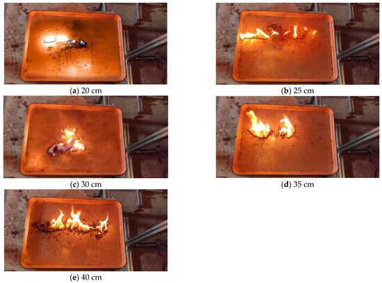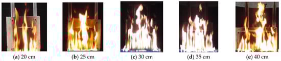 In the experiments, the flame shape changed and was unstable in different stages. The flame shapes in the stable combustion stage, which occurred nearly 60 s after the drops were observed, were different for the different panel lengths, as shown in Figure 5.