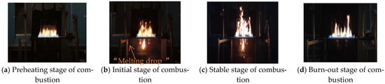 In high-rise building fires, the PE molten droplets drip down in the vertical direction and initiate the exterior insulation material of the lower floors [22]. Therefore, molten droplets play an important role in the spreading of high-rise building fires. As shown in Figure 3 and Figure 4, according to the firing characteristics and dripping process, the whole combustion process was divided into four stages. After the ignition, the temperature of the PE sandwich panel increased, which was defined as the preheating stage of combustion before the first firing droplet was detected. Subsequently, intermittent droplets were observed. However, the time interval between the appearance of the droplets was unpredictable. This stage was defined as the initial stage of combustion. As the fire continued, droplets appeared continuously. The droplets accumulated in the middle of the sandwich panel until the force of gravity was greater than the viscous force on the metal surface of the sandwich panel. At this time, the droplets broke free from the constraining force of the surface aluminum laminate and dripped into the tray, forming the molten fire. A series of continuous droplets was observed, but the time interval between the different groups of continuous droplets remained the same. A cavity occurred at the bottom of the panel, and the PE on the upper side melted and flowed down after sustained heating. The number of droplets decreased as the heating continued. This stage was defined as the stable stage of combustion. After the stable stage, the droplets were occasionally observed with the number of droplets decreasing and the time interval increasing, and until no droplets were observed, which was considered the burnout stage. The phenomena of the four stages agree with the temperature curves.