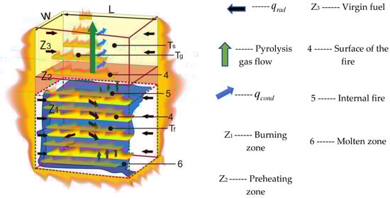 The schematic diagram of the vertical fire spread of the metal sandwich panel was established by improving the physical combustion model [23,24], as shown in Figure 6. The burning of the fire source released a substantial amount of heat, and heat conduction, heat convection, and thermal radiation resulted in the heat transfer to the unburned PE. The PE was heated and expanded, but the aluminum surface constrained the flow of the molten PE. The combination of gravity, channel constraints, and viscosity made the molten PE flow toward the bottom of the panel. The molten PE closest to the flame decomposed completely, as only parts of the PE were left at the sides and bottom. Therefore, the unburned PE reached the pyrolysis temperature and ignited. As the PE burned, high-temperature molten droplets were generated and stuck to the surface of the panel. Due to the internal heat transfer to the unburned PE, the droplets caught fire and dripped to the bottom, resulting in a pool of burning, molten PE. Due to the combined effect of the burning panel and the molten PE, the fire spread.