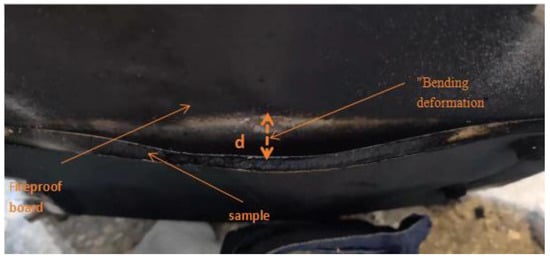 Due to the bending deformation, the combustion behavior differed on both sides of the panel with a length of 40 cm. The high-temperature area of the panel increased, which accelerated the pyrolysis process and produced large amounts of pyrolysis gases. The hot flammable gases rose and ignited externally, which caused the top flame phenomenon, as shown in Figure 8. Sheet deformation occurred between the sandwich panel and the insulation board. As the panel length increased, the sheet curvature increased, and vice versa, as shown in Figure 9. The bending deformation occurred because of the presence of the bolts on both sides of the panel. As the length increased to 40 cm, the combustion became more intense because of the top flame. The top flame also heated the top of the sandwich panel, which accelerated the pyrolysis process and caused greater deformation.