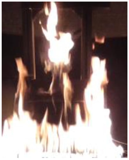 The part of the sandwich panel that was close to the fire source burned quickly, and the upper part shrunk due to heat. The flame spread rate was higher than the burnout speed of the sample. In addition, the bolts held the panel together during combustion, causing bending deformation of the aluminum alloy sheet (Figure 7), which accelerated the pyrolysis process, produced pyrolysis gases, and intensified the combustion of the sample. Bending deformation of the sandwich panel containing bio-derived constituents was also produced under the action of turbulent flame [25].