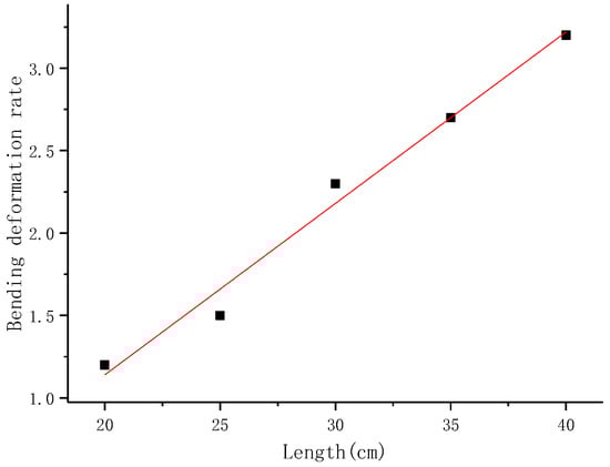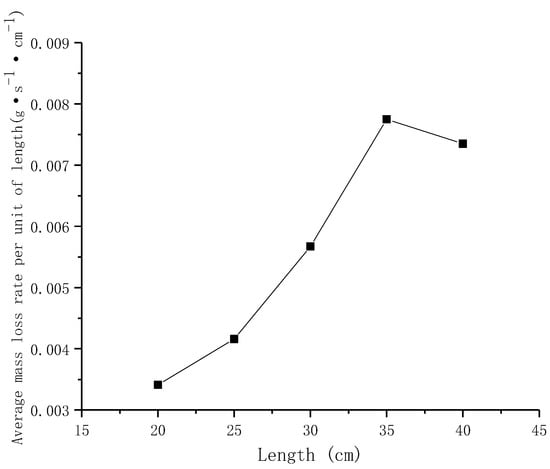 The average burning rate of the sample during the steady combustion phase was calculated. The results showed that the rate of mass loss of the metal sandwich panel increased with an increase in the panel length. The average mass loss rate was deduced using the methodology described by the authors of Ref. [29]. = is defined as the average mass loss rate per unit length. The larger the value, the more intense the combustion is, and the greater the fire risk is. The results are shown in Figure 13.