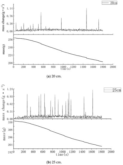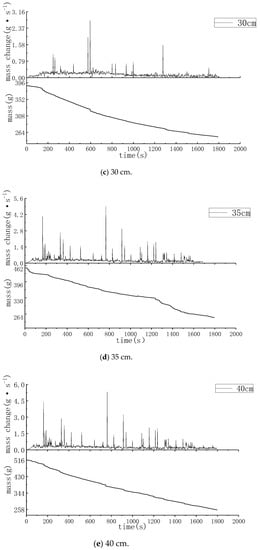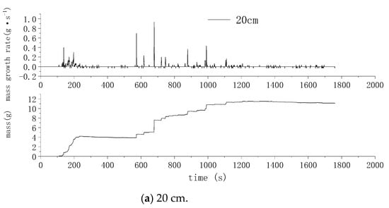 The results of the mass changes in the droplets are shown in Figure 10. The mass of the droplets increased with an increase in the length of the sandwich panel. The droplet mass was lower for the panel with a length of 40 cm than that with a length of 35 cm, although the dripping frequency was higher. The mass of the droplets of the 40 cm long panel was lowest at the start of combustion. The mass change rate was higher because of the longer time interval of dripping for A1-A4 and the large mass of the droplets. The drip time of A5 was continuous and stable. The mass of the droplets was low, and the rate of mass change was low. Thus, the mass growth of A5 was a smooth curve. Although the mass growth of A5 was lower at the beginning, the accumulation rate was higher than that of A1-A4, and the mass growth was higher than that of the other four panels at 446 s. With the increase in length, the dripping time decreased, and the curve of the mass change increased gradually from the segmented line. Figure 3 shows that the fire extinguishing times of the burning droplets were different for different panel lengths, and the longest extinguishing time was observed for the panel with a length of 40 cm. The longer the burning time, the more unstable the mass of the droplets was. The mass of the droplets was not related to the mass growth of the droplets.