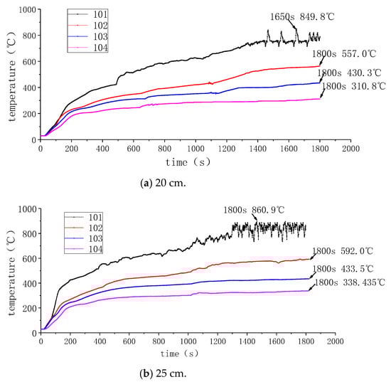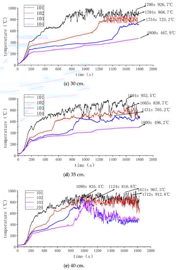 The temperature curves are shown in Figure 11. The numbers 101, 102, 103, and 104 in the legend correspond to the thermocouple layouts P1, P2, P3, and P4 described in Section 2.1.4, respectively. It was observed that the temperature increased with the combustion time. The peaks in the curves indicate the time when the thermocouples were exposed to the fire. The trend of the temperature change was the same at all points. An increase in the temperature was observed for the 30 cm sample at about 1100 s, and the times were lower for the 35 cm and 40 cm samples. The discussion of the droplet mass in the previous section shows that the mass loss increases as the sample length increases. A larger droplet mass means that the un-pyrolyzed PE material is more likely to come into direct contact with the flame and heat up rapidly. The highest temperature occurred at P1. The maximum temperatures under the five conditions were 849.806 °C (1650 s), 860.943 °C (1800 s), 926.746 °C (1700 s), 952.463 °C (1604 s), and 967.332 °C (1611 s), respectively. The maximum temperature at P1 increased with an increase in the sample length. The rate of change of the temperature increased as the length increased. At longer lengths, there were more peaks, and the difference between the peaks and troughs was larger. This result was attributed to the increases in the flame pulsation with the increasing sample length, which was caused by the thermal buoyancy and instability of the boundary layer. There was a positive correlation between the intensity of flame pulsation and the instability of buoyancy. The Grashof number () was used to represent the instability of buoyancy [4].