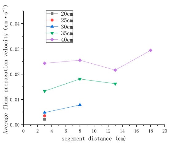 The flame spread rate is a crucial parameter to determine the combustion characteristics of metal sandwich panels and assess the fire risk. The purpose was to measure the flame propagation speed in the vertical direction in the middle of the sandwich panel. When the flame spread to the thermocouple, the temperature rose rapidly, and the temperature fluctuated. Figure 14 shows the flame spread rate. It was observed that the flame spread rate increased with an increase in the sample length. Heat feedback was the decisive factor in the speed of the fire spread. Heat feedback increased with an increase in the sample length, which caused the flame spread rate to increase as the length increased [32].