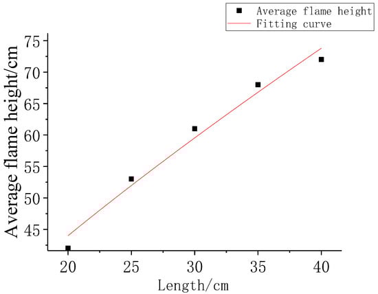In order to establish the connection between the reduced size and the full size, the important physical parameters must satisfy the Froude similarity model. The Froude similarity criterion is to satisfy the kinetic similarity to ensure the Froude number of the reduced size and the full size are the same. The Froude number characterizes the relationship between the inertial force and the buoyancy ratio of the fluid. The magnitude of flame height depends on Fr. This experiment can take a dimensionless flame height, explore its linear relationship with , and derive the relationship between the average flame height and length. Fr represents the ratio of the inertial force of the fluid to the heavy force level (the buoyancy force in this experiment) [34]: