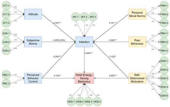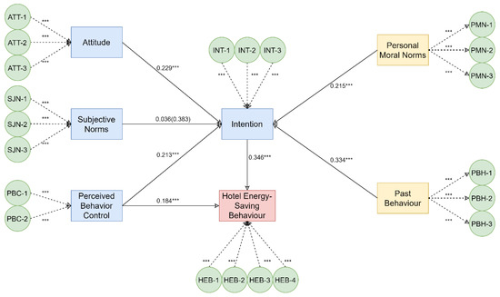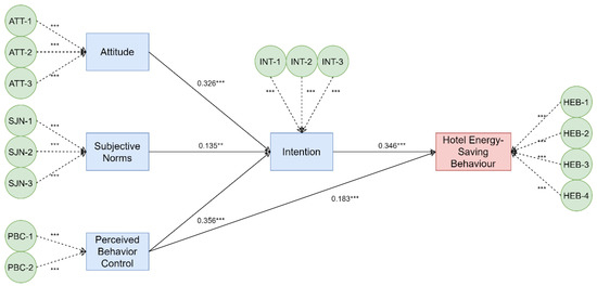 The TPB model (Figure 4) included three attributes of the original TPB model. The coefficient of determination explained 41.9% of the variance in intention to perform hotel energy-conservation behaviour and 22.1% of the employed hotel energy-saving behaviour. In Figure 4, the results of the analysis present that all TPB attributes influenced the hotel energy conservation intention. Among the three TPB attributes, PBC (β = 0.356, p < 0.001) had the greatest effect on hotel energy conservation intention. Additionally, attitude (β = 0.326, p < 0.001) was the second-greatest influence on customers’ energy conservation intention. However, the relationship between subjective norms (β = 0.135, p = 0.003) and intention was very small. The results suggest that intention (β = 0.346, p < 0.001) had a high positive correlation with hotel energy-saving behaviours. At the same time, a smaller correlation between PBC (β = 0.183, p < 0.001) and hotel energy-conservation behaviour was presented.