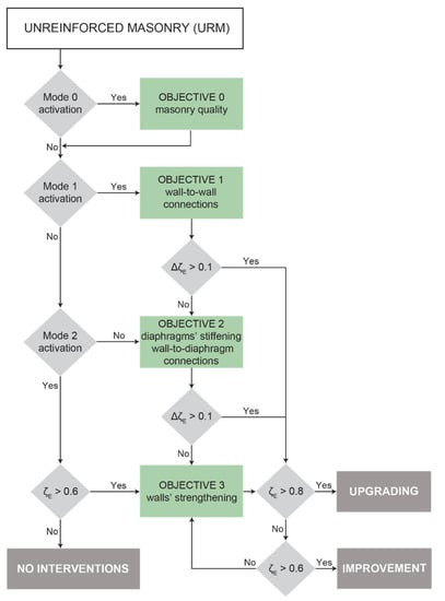 Figure 1 shows an incremental procedure which guides the choice of intervention types as a function of the vulnerabilities commonly recognized in URM buildings and in the framework of those seismic performance targets (i.e., the ‘objectives’) required by the seismic code. Mode 0 stands for crumbling of inadequate-quality masonry (no macroblocks can be identified); mode 1 refers to OOP failure of macroblocks (no box-like behaviour can be identified). Mode 2 involves the IP resistance of walls: for the best performance, shear damage should occur preferably in spandrels than piers (i.e., keeping the bearing walls extended for the whole height of the structure as undamaged as possible) [,,]. As modes 0 and 1 describe negative conditions (i.e., those which imply the potential loss of a building), the chart proposes specific countermeasures to contrast their activation (objectives 0 and 1, respectively); conversely, mode 2 is the preferred structural behaviour; therefore, the interventions are applied when it is not reached (e.g., interventions on diaphragms, objective 2). It is worth noting that the strengthening of walls is proposed only following mode 2 interventions (objective 3), when minimum performance levels are not met, in spite of the box-like behaviour. The progressive application of interventions minimizes the risk of their potential unfavourable contribution, as each stage is propaedeutic to the following one. Moreover, the impact of interventions can be adjusted depending on the final level of expected seismic performance, i.e., either improvement (lighter interventions) or upgrading (massive and/or widespread interventions).