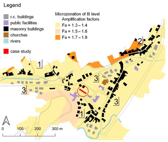 Marl is the main lithology of the settlement; moreover, alluvial deposits supplied building materials in terms of stones (limestone, sandstone), binder, and aggregates for mortar []. The third-level seismic microzonation defines the amplification factors for such types of subsoil: for structural periods ranging from 0.10 to 0.50 s (i.e., those typical of ordinary masonry buildings []), the whole area where the village stands refers to a factor of 1.40. This is consistent with a class C subsoil according to []. The PGA expected at the damage limitation (DL) and severe damage (SD) limit states are, respectively, 0.09 g and 0.223 g [].