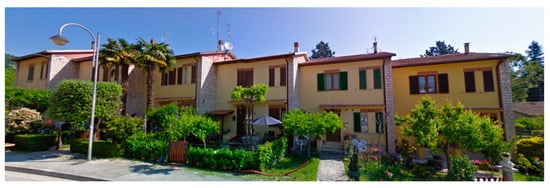 Residential buildings account for 75% of the total stock in Europe, of which 64% consists of single-family houses, i.e., detached, semi-detached, or terraced houses (the rest being apartment blocks) [,]. In Italy, 87% of residential buildings correspond to masonry and reinforced concrete (r.c.) constructions; of these, more than 90% (masonry) and 55% (r.c.) were constructed without seismic-resistant detailing (the reason being that the reference building codes for anti-seismic design of structures passed in Italy in the early 1980s) []. Italy also has a high seismic risk (in terms of both hazard of the sites, and vulnerability and exposure of the buildings) []: 45% of the entire building stock is located in moderate-to-high seismic hazard areas (seismicity classes 1–2 out of 4) [,]. Single houses account for 72% of the whole built stock [], among which terraced buildings are widespread, particularly in historical settlements located in hilly or mountainous contexts [].