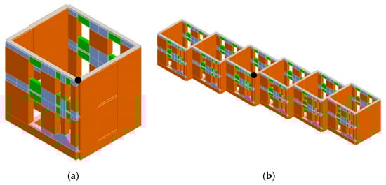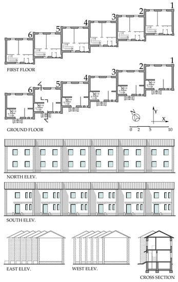 The case study, henceforth referred to as IACP building, is a terraced building built in the mid-1960s, i.e., earlier than any seismic regulation applied to Pieve Torina []. It is composed of six units stretching along the NW–SE axis for a length of 43.17 m and a depth of 6.85 m towards north. Each unit has a compact and regular shape (plan of 7.57 × 6.85 m) with vertically aligned openings on the south and north facades only (Figure 3). The building has two storeys (gross area of 50 m2 per level and unit) and a basement, emerging for 0.70 m from the ground level, for a total elevation of 6.90 m in the north and the south facades from the ground to the eave line. Units are shifted for about 1.5 m. The gable walls on the east and west sides are completely blind; the ridge stands at 9.07 m above the ground. The walkable area of each floor is 34 m2, while the staircase has a footprint of about 4 m2. A loadbearing wall divides the raised ground floor, whilst, in the upper storey, there are only non-structural partitions; a non-structural ceiling also completes the first storey. The gross volume above ground is about 2094 m3.