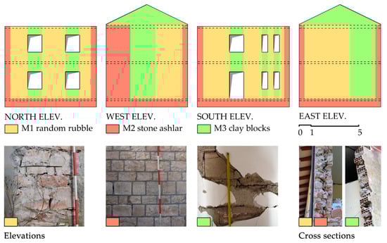 Despite the simple architectural appearance, material usage in loadbearing walls was rather patchy. Walls are made of (see Figure 5): (a) 45-cm-thick random rubble limestone masonry (M1 type, yellow colour), (b) 45-cm-thick ashlar masonry (M2 type, red colour), and (c) 25-cm-thick hollow clay block masonry (M3 type, green colour); for all the masonry types, cement mortar was used to embed units. M3 masonry is used in the east and west walls, where the staircase is, in gables, in the internal wall at the ground floor, and in the spandrels of the north and south facades; the rest is made of either M1 or M2 masonries, depending on where the ashlar finish is. However, local crumbling of ashlar masonry revealed diamond-shaped stones and the same two-leaves section of M1 type; consequently, following a conservative and simplified approach to the model, the two types were considered as one (M1, see Section 2.5).