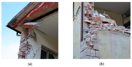 Floor slabs are made of a clay block ribbed system sold in those times under the SAP acronym []. Blocks were aligned on the work site and bound with cement mortar, including steel rebars (Ø4 to Ø6) at the bottom and top faces so that the resulting joists could be mounted without formworks and scaffolding. The structural height of the blocks could vary from 8–12 cm (lofts and ceilings) to 16–20 cm (floor slabs), and concrete was poured just to fill the spaces left between the joists, as contemporary codes [] allowed without any overlay. These slabs were usually bordered by an unreinforced concrete ring beam, which offered the support on the walls and the anchorage of the longitudinal reinforcement of the joists; indeed, these ring beams were evident during the surveys, owing to the seismic damage (Figure 6). Finally, the roof structure is also typical of those years, that is, precast r.c. joists supporting a hollow clay tile decking. These joists are exposed to shear failure, as they do not have a specific reinforcement [].