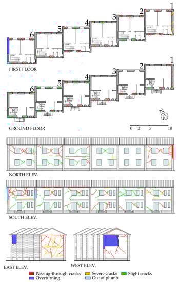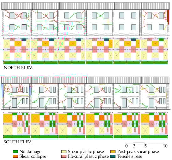 - Diagonal shear damage in piers of the north, south, and east facades, heavier in the extreme units (no. 1 and 6) and in the upper storeys (Figure 8a–c);