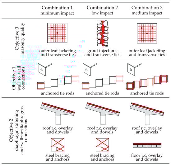 For the IACP building, three strategies were proposed according to an increasing impact on a building’s usage continuity and on the expected structural performance in strengthened conditions (performance ratio ζE, see Section 1.2). Figure 11 shows the intervention techniques considered suitable for each target of improvement and their significant combinations for the building in question. Three levels of impact, i.e., minimum, low, and medium, were taken into consideration. Except for the need for an r.c. overlay of the roof, which is common to all cases: