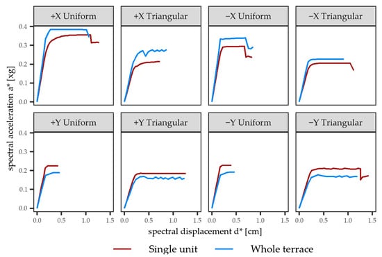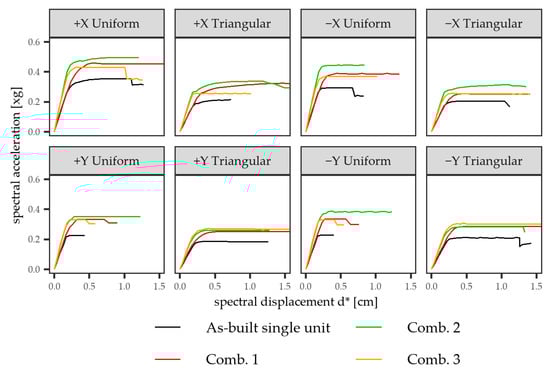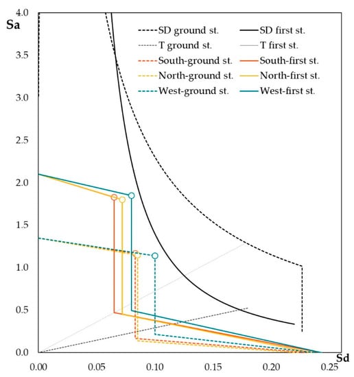 The same procedure was applied to OOP mechanisms, which cannot be taken into consideration by the numerical model and whose countermeasure was the application of tie rods to the loadbearing walls of IACP buildings. Ties were designed to withstand the PGA at the DL limit state and, therefore, ζE = 1 in strengthened conditions for both hinge positions in the overturning mechanism (see Section 3.1.2). The increase in the performance ratio ζE was relevant and equal to 0.70 on average (Table 7). The capacity curve with tie rods (Figure 16) is piecewise and shows a sudden drop where tie rods reach the yield displacement (conventionally assumed at 0.1%); as north and west facades have different spans, tie rods have different ultimate displacements in the two directions, which are even closer to the unit.