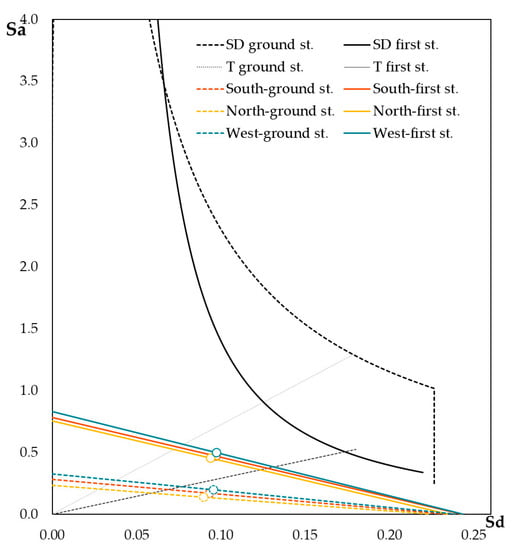 Capacity curves of local mechanisms with tie rods and demand spectra at ground and first floors (empty dots represent the displacement capacity at SD limit state; radial lines indicate the structure’s period T at displacement capacity).