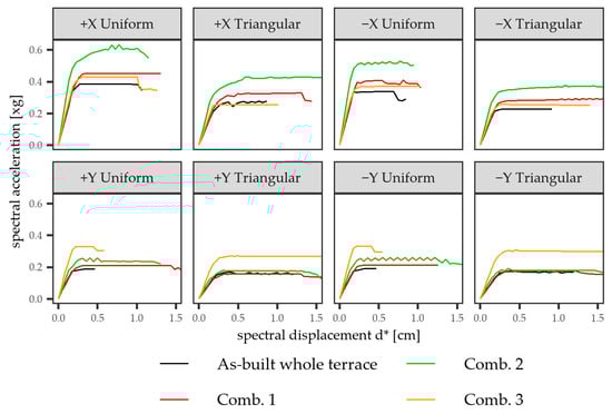 With the only exception of combination 1 applied to the overall terrace model, all strategies increased ζE by 0.6, independently from the number of considered units; hence, these interventions may ensure an improvement of the seismic capacity of the IACP building according to the current regulations. Lastly, combination 2 for the single-unit model led to a ζE very close to 0.8; hence, it can even be considered as an upgrading intervention.