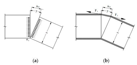 - Perfectly plastic hinges. In this case a constant distribution of stresses is assumed along the crack, equal to tensile strength (Figure 2a); the displacement profile is linear and equal to , where is the maximum crack opening, with angular opening of the hinge, t the member thickness and x the local axis parallel to the crack. The internal work of the i-th hinge becomes: