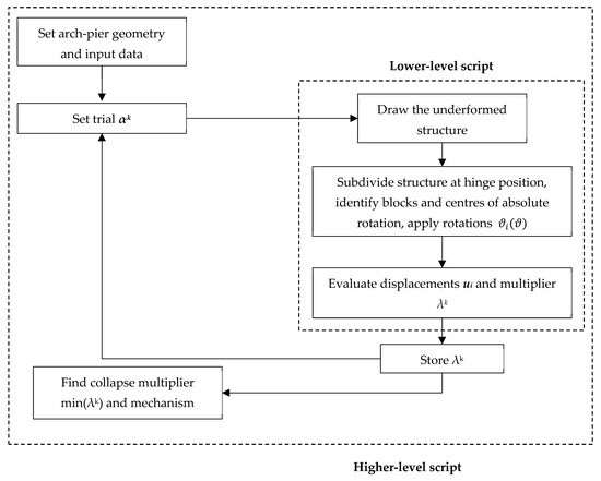 Equation (4) represents an optimisation problem, where the load multiplier λ is minimised by identifying the corresponding position of the four flexural hinges. To solve the problem, an automatic tool aimed at finding the location of the hinges in the masonry arches with side piers was implemented in the software Gmsh [29]. Gmsh is an open-source 3D finite element mesh generator with a built-in CAD engine and post-processor, with the possibility of scripting. In particular (Figure 3), given a trial position of the hinges , a low-level script draws both the undeformed structure of the arch, and the structure after the activation of the mechanism, simplifying the identification of the blocks with the applied vertical and horizontal forces and centroid displacements , in Equation (3), and allowing for the evaluation of the load multiplier . The minimisation of Equation (4) is carried out within Gmsh by a higher-level script by systematically exploring various hinge positions . The admissible hinge position is from 0° to 180°, with the addition of the base of the left pier, assumed conventionally as , and the base of the right pier, conventionally .