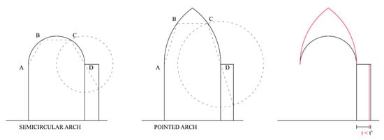 From the Middle Ages derives the most widespread empirical rule for the sizing of the piers, attributed to Father Dérand by Rondelet [31]: dividing the round or the pointed arch in three equal parts, four points A, B, C and D are determined (Figure 6). With centre in the extreme D and drawing a circle of CD radius, the projection of CD on the horizontal axis determines the minimum thickness of the piers. It is possible to see that the application of this rule to circular arches leads to a ratio B/s = 0.5 (t’ in Figure 6), while a pointed arch of equal span needs a smaller pier thickness (t).