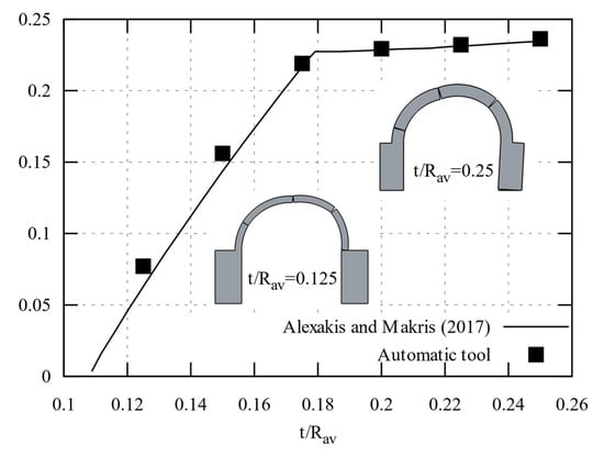 A validation of the automatic tool was performed considering the analytical results shown in [33] regarding the limit analysis of semicircular buttressed arches. The system having , , was analysed at increasing . Consistently with [33], the average radius is considered for the parametric analysis. The search for the hinge location corresponding to the minimum load multiplier is performed by using an angle interval equal to 15°. The results are shown in Figure 7.