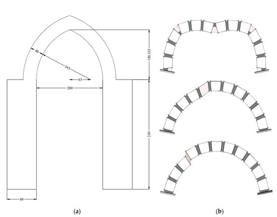 Validation of the automatic tool for limit analysis and comparison with DMEM: (a) layout of the system, and (b) typical failure modes of an arch [21]. Dimensions in cm. Adapted with permission from Ref. [21]. Copyright 2021 Elsevier.