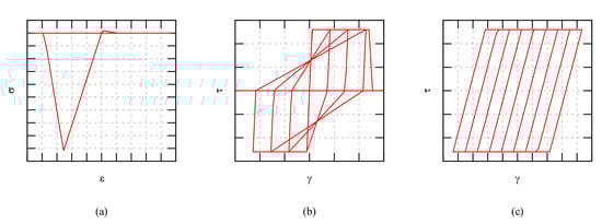 Focussing now on the plastic cases 2–4, in Equation (2) the dependence on the Lagrangian parameter is given by a first-degree homogeneous function for the displacements and in case of small rotations. If is also first-degree homogeneous function in , the dependency cancels out and the multiplier is independent on the amplitude of the mechanism: this is the case of perfectly plastic hinge (2), not resisting hinges (3) and perfectly plastic reinforcement (4). The perfectly plastic hinge is not relevant to masonry, which is always characterised by quasi-brittle post-elastic behaviour in tension, and thus will not be considered in the following.