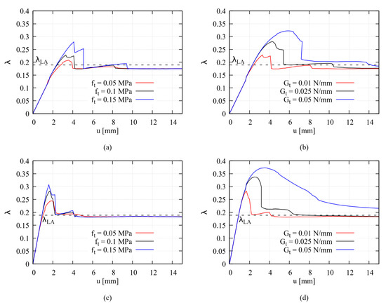 λ-u plots for the analysed models: (a,b) weak masonry, (c,d) strong masonry. (a,c) plots at varying ft, (b,d) at varying Gt.