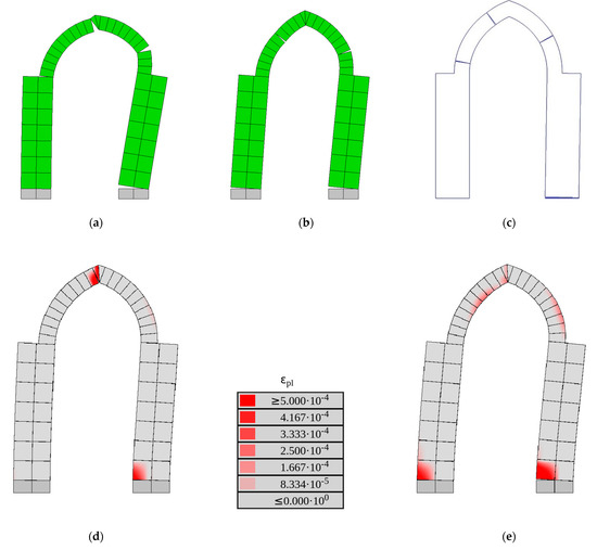 A final consideration regards the evolution of plastic strains, representing the opening of cracks, and the effect of fracture energy on hinge position. In Figure 11 (d and e) the plastic strain at peak load for weak-masonry models with ft = 0.1 MPa and respectively Gt = 0.01 N/mm and Gt = 0.05 N/mm are displayed. While for low fracture energy values (Figure 11d) the plastic strain contour plot is mostly coincident with the final position of the cracks (Figure 11a), with two some other hinges yet to open, the model with higher Gt shows a plastic strain concentration, i.e., the onset of cracking, at both pier bases (Figure 11e). This crack layout is not matched by the final position of the hinges (Figure 11a), and thus implies a redistribution of plastic strain during loading, which in turn is responsible of the overall higher strength shown by high-Gt models. The crack at left base may eventually close with increasing keystone displacement, determining the final collapse configuration displayed in Figure 11a, or remain active as in the configuration of Figure 11b, which represents Model 1 collapse configuration.